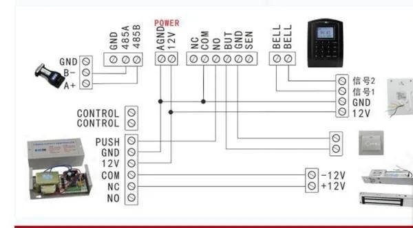 其中需要特别说明的是电控锁的控制,两根线没有正负之分,只要一根接在NO端子上,一根接在GND上就可以了,接电控锁的时候一定要特别注意,首先要把门禁专用电源和简易型门禁一体机的开门延时调到最小,否则电控锁高达3A的大电流犹如山洪暴发,会将连接的设备烧毁。