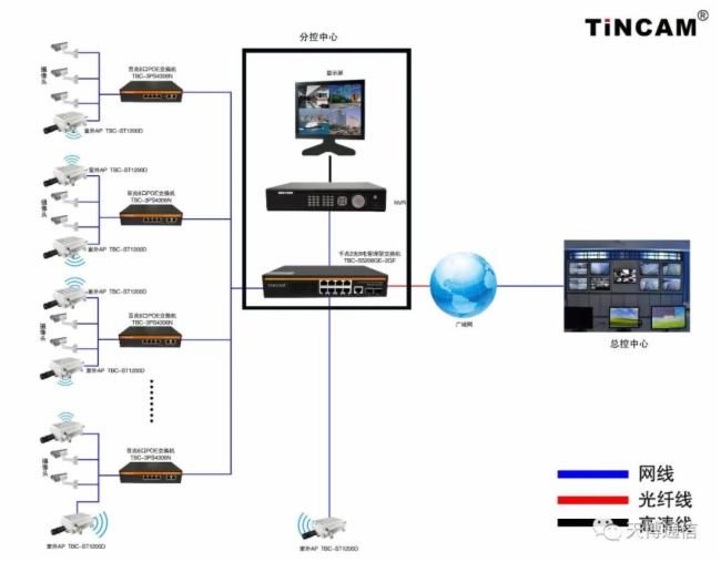 在本系统中,道路监控点、分控中心、总控中心之间的视频传输均采用了光纤作为传输通道。前端监控采用的是采用进口的主芯片和PSE供电芯片传输快速以太网并带有AI智能管理功能的智能以太网POE供电,永不烧机;具有超高背板设计而拥有极速数据处理能力,提高数据流畅传输性能.精工钢合金机身静电烤漆,促进双流散热、性能稳定及无故障工作≥3万小时的TBC-3PS4306N给摄像头和室外定向提供供电和实时传输监控录像,然后通过TBC-OT2517SD天博室外定向AP数据传输,数据到分监控室也是有TBC-OT2517SD天博室外定向AP进行接收,由TBC-PSM5410GE-2GF是全千兆管理型POE交换机进行管理到监控屏,最后用光纤传输到总监控室。