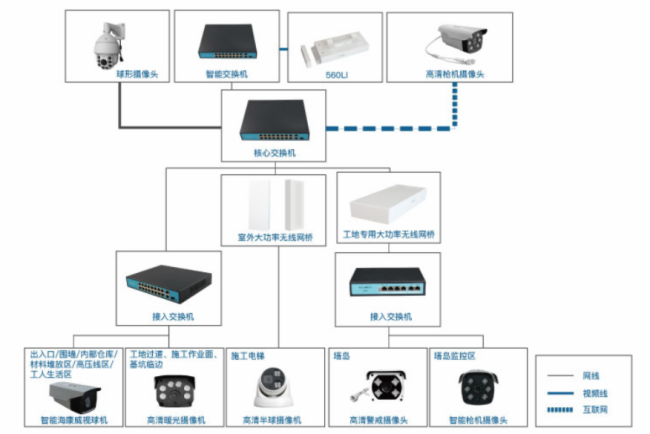 建筑工地面积大、布线难,且监控点位多,本方案主要采用工地专用无线网桥 ,微波传输产品。不仅解决监控信号传输问题,还无需花费大量人力挖地布线。设备支持无线自动选频功能,避免网桥之间的频率干扰 ,保障视频监控数据传输的稳定。