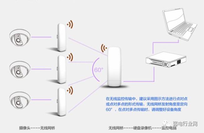 如果摄像头分布的位置到监控中心形成的夹角小于60度 ,可考虑点对多点传输。可以减少发射端网桥和成本。