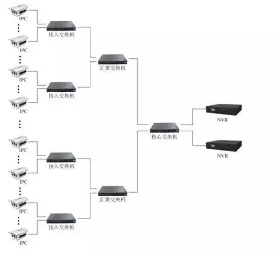 针对于50个点以上的中大型工程,需要采用三层网络架构:接入层、汇聚层、核心层。